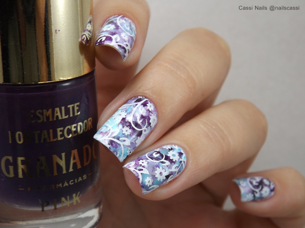 Comecei esmaltando as unhas com uma camada do Bianco da DNA Italy, em seguida com os esmaltes Bianco, Boneca da Lorena, Janis da Granado e com o Baby da Drica, fiz marmorizado com o carimbo. Carimbei com esmalte de carimbo branco.